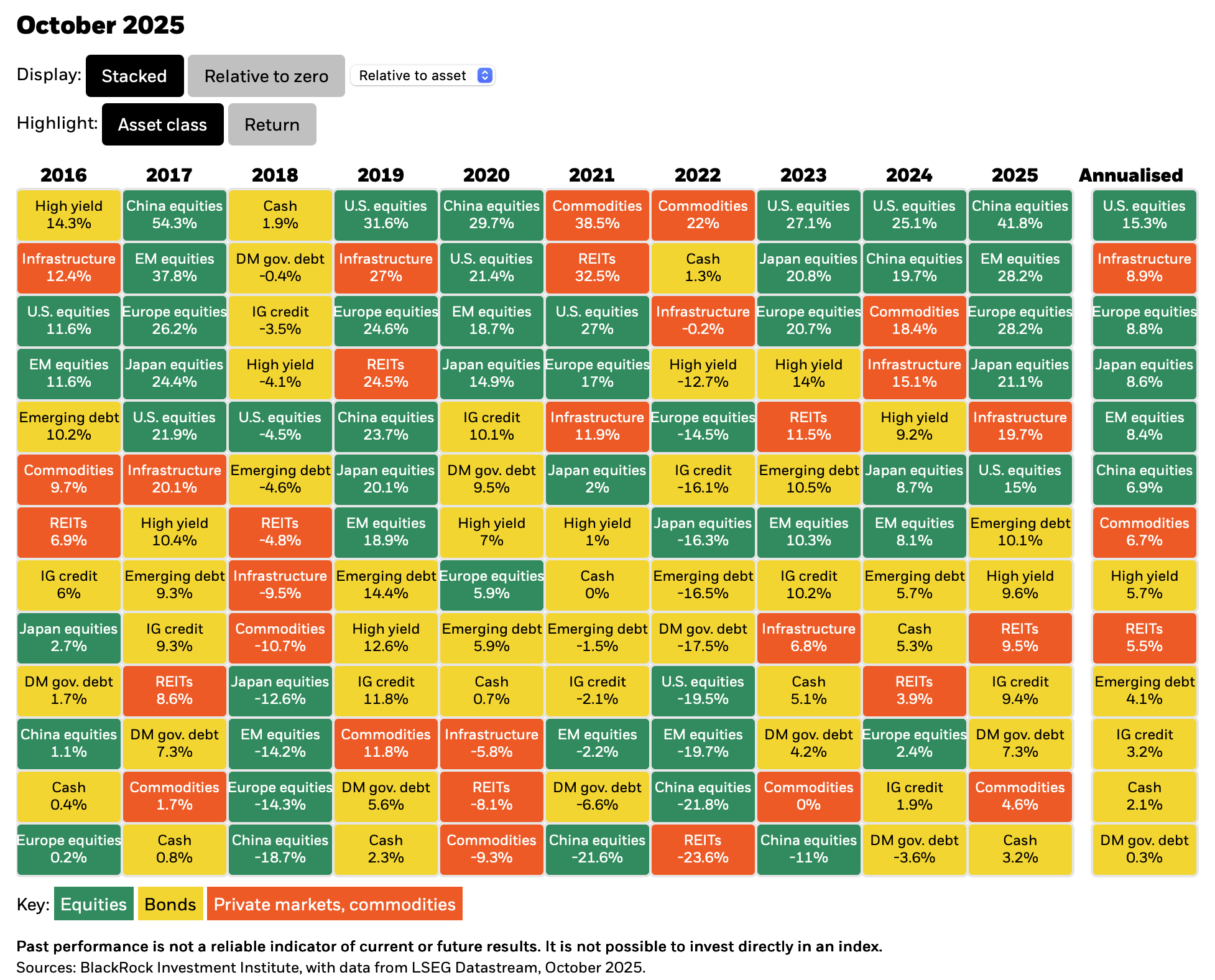 Blackrock's "asset return map" shows various asset classes and the returns they've made over the last decade.