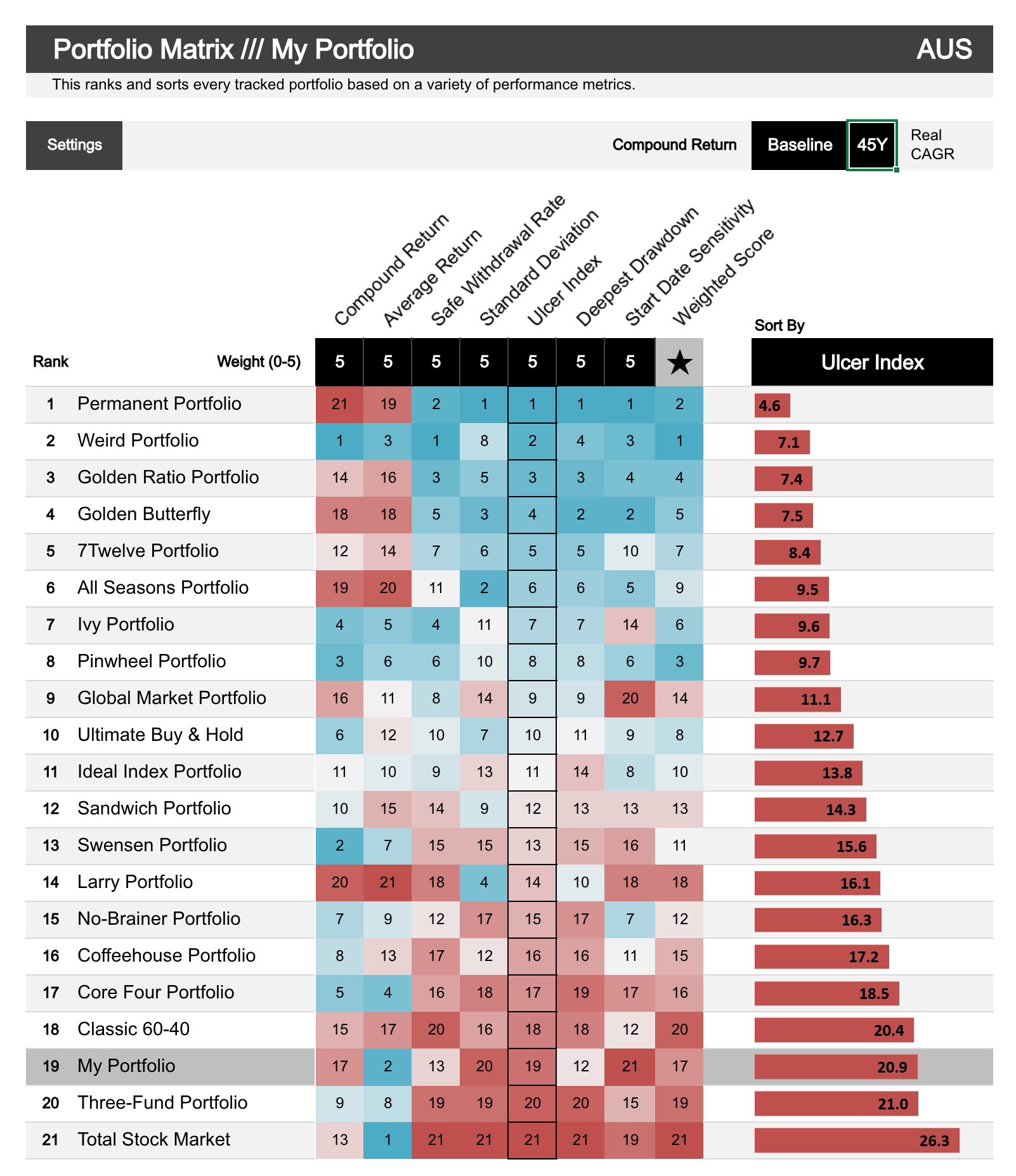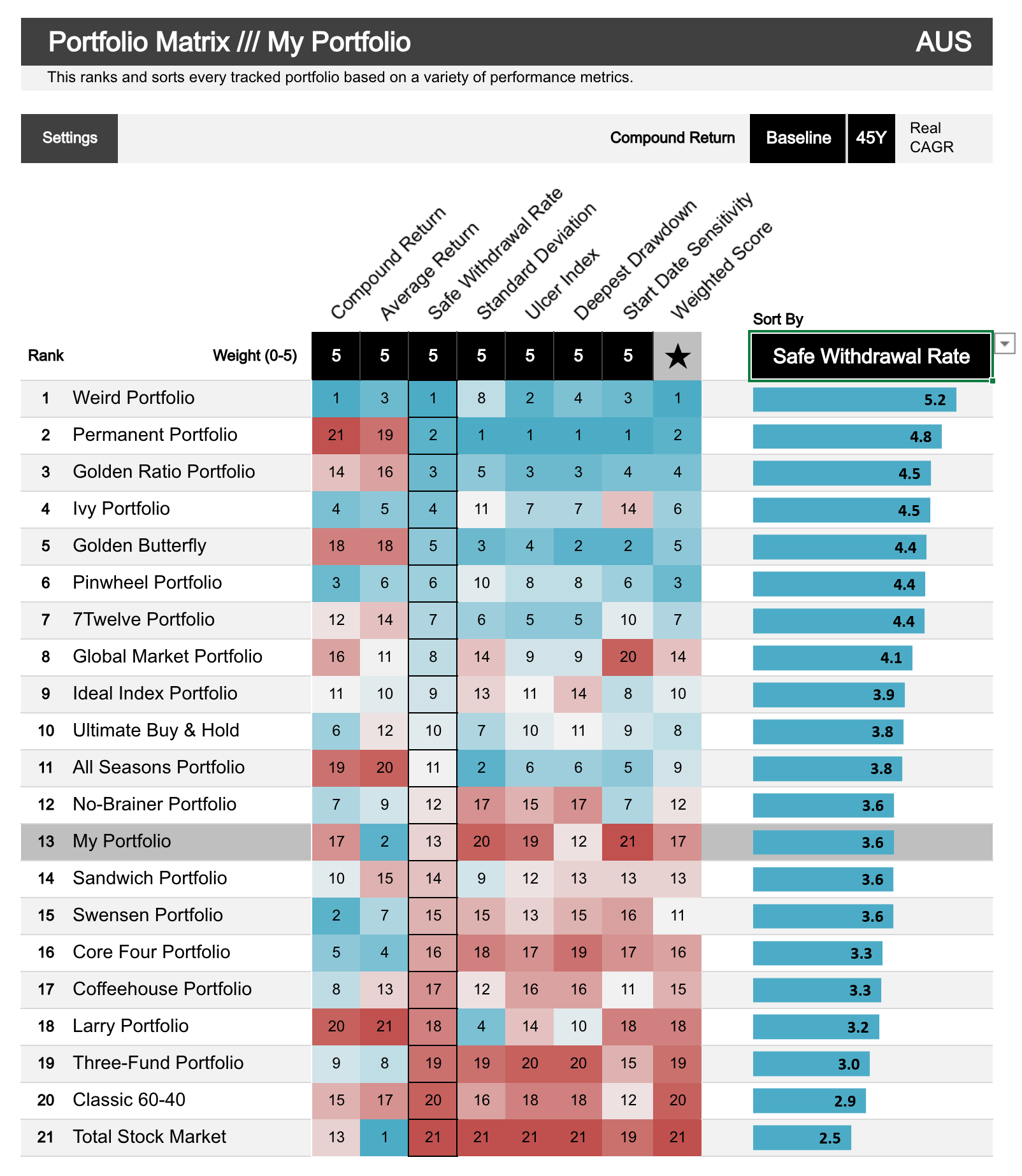 A good example of the depth of Portfolio Charts is this blog post from April 2024 from the creator of Portfolio Charts explores different portfolios in retirement. The takeaway I got from it is global diversification is good to protect yourself against one country *cough* USA *cough* taking a shit and asset diversification is good so that you don't have all your eggs in the equities basket should the stock market tank *cough* AI bubble *cough*. How that relates to an exact portfolio makeup, I'm still messing around with.