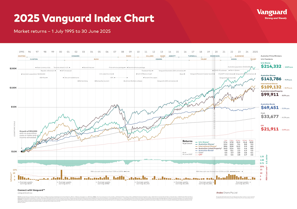 Vanguard has an excellent chart showing the returns of $10,000 from 1995 to 2025 of various asset classes.