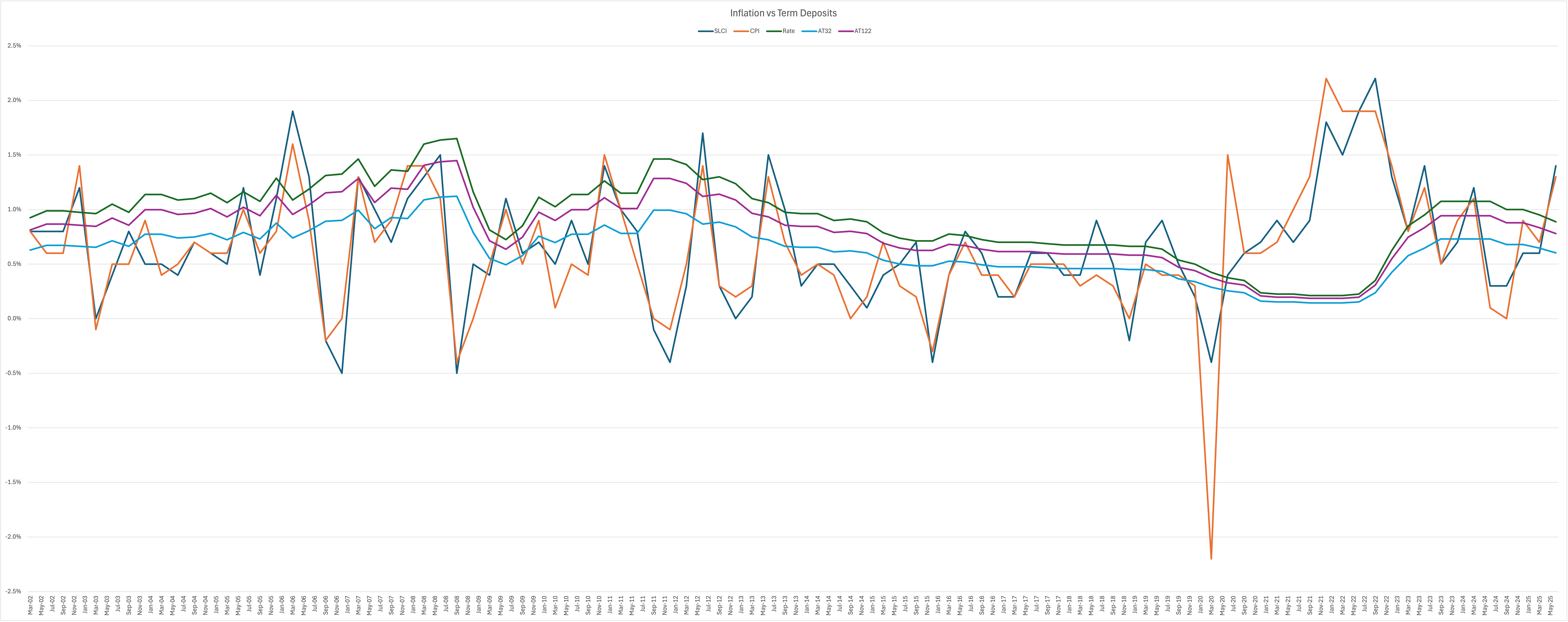 With this data, I can pretend that I started a 3 month term deposit at 3.15%pa on the 31st of March, 2002 so on the 30th of June, I have 0.725% more money. Over that same period of time cost of living went up by 0.8%, so for that quarter I lost money. The data I have lets me do this every quarter until September 2025.