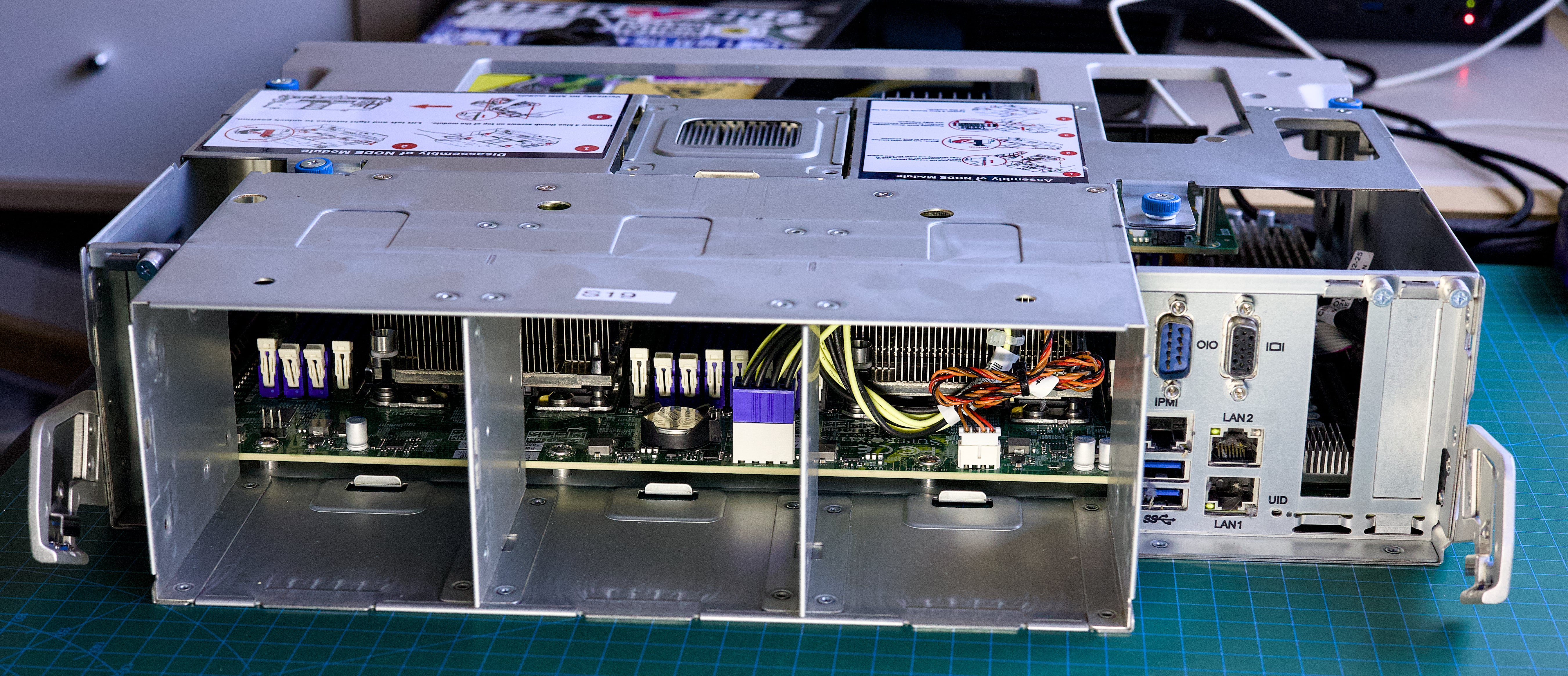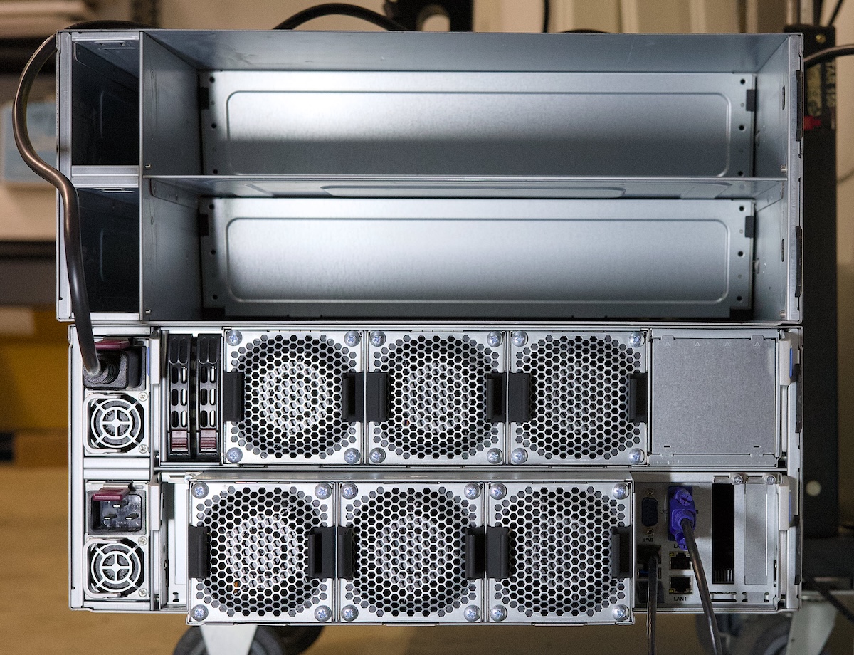 Here's the rear of the server with the fans and PSUs, with one of the fans & PSUs sticking out: