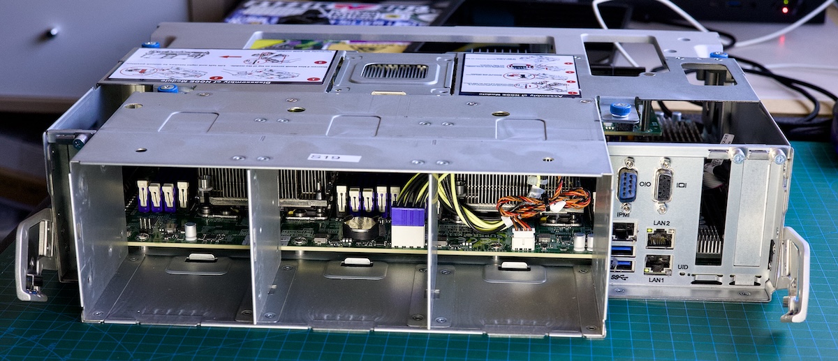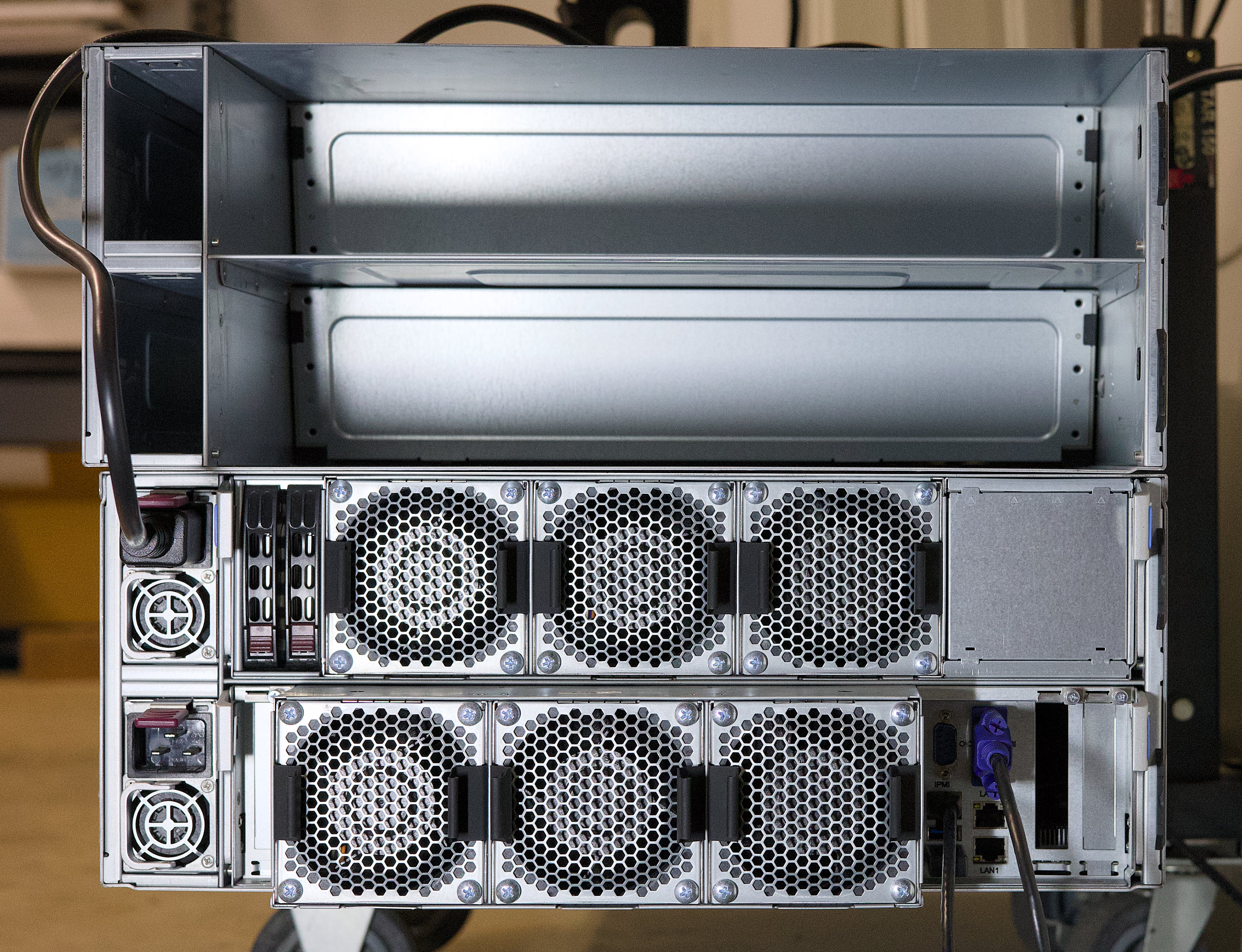 This is two servers. The top one has the PSUs, fans & mainboard bays removed. Bottom one has them installed