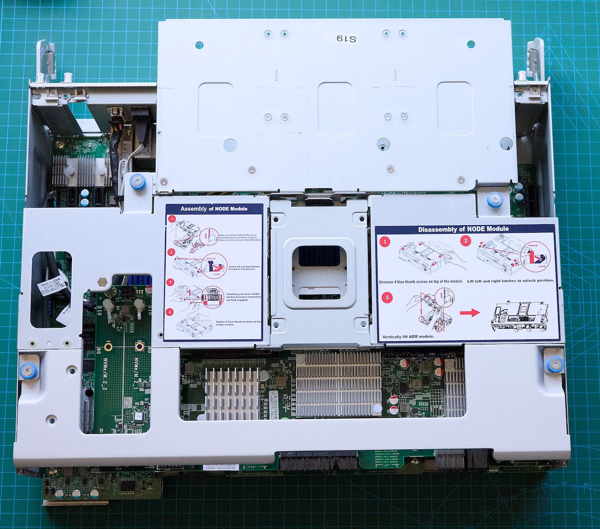 The mainboard just slides out as its own tray with the Supermicro AOM-S3616 mezzanine card on top of it.